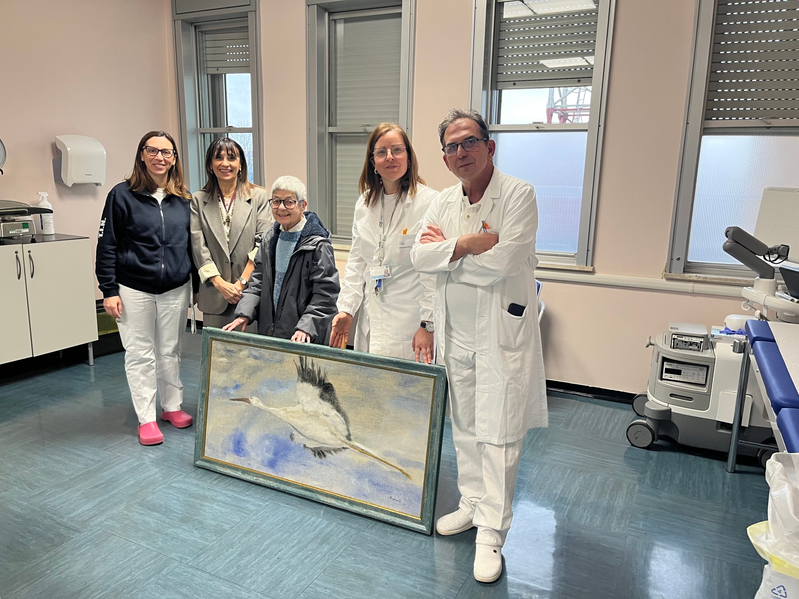 La direzione e i professionisti hanno ringraziato di cuore l’artista per il suo dono e il generoso pensiero rivolto alla nascita. “Sono molto affezionata a quest’opera – spiega Elsia Macaluso – perché la cicogna simboleggia per me la libertà. Sono felice di lasciarla in buone mani, in questo luogo così adeguato al soggetto dipinto, mi sento emozionatissima”.
